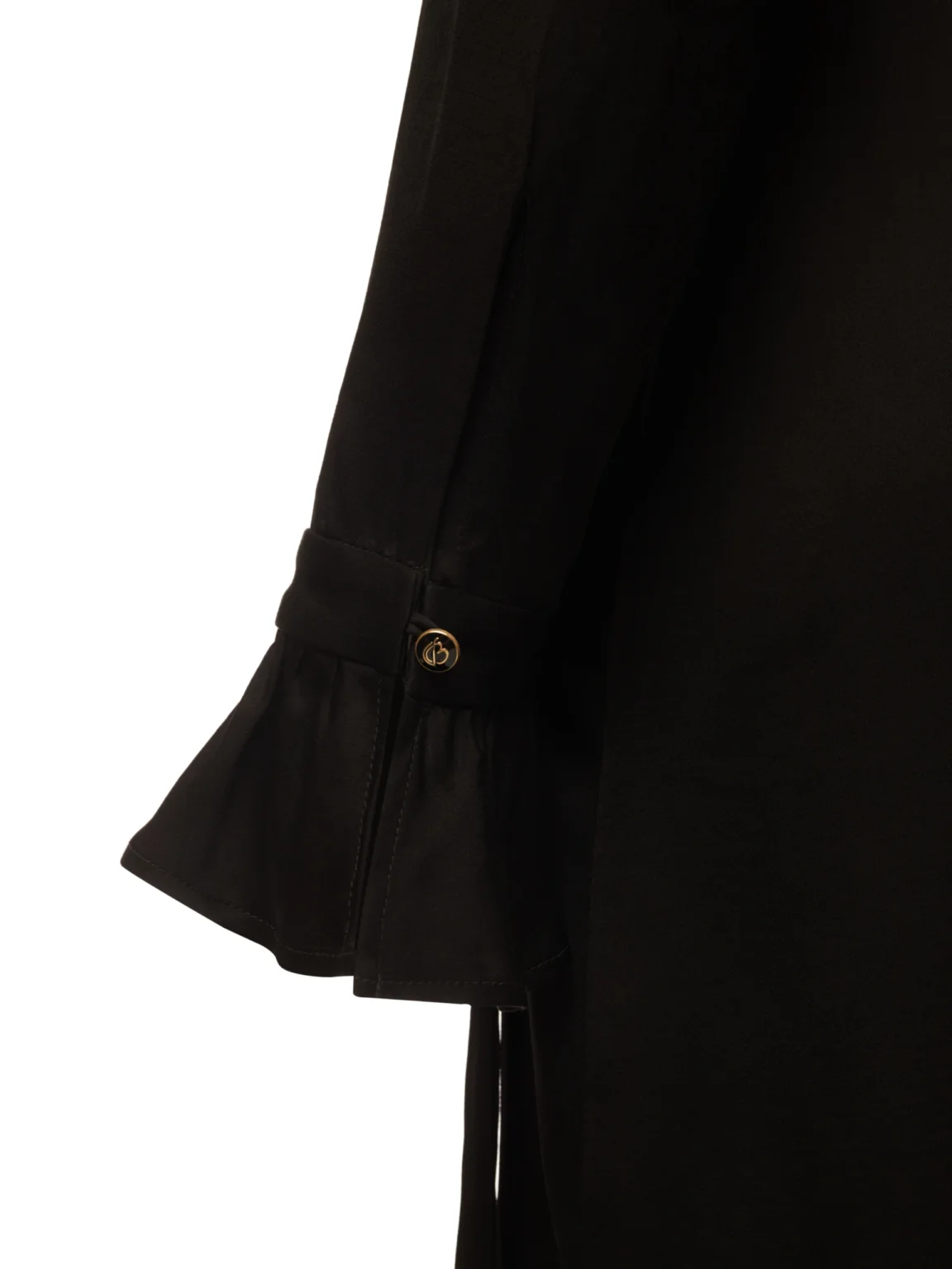 Mini dress on the smell with flounces at the bottom of the sleeve.