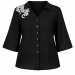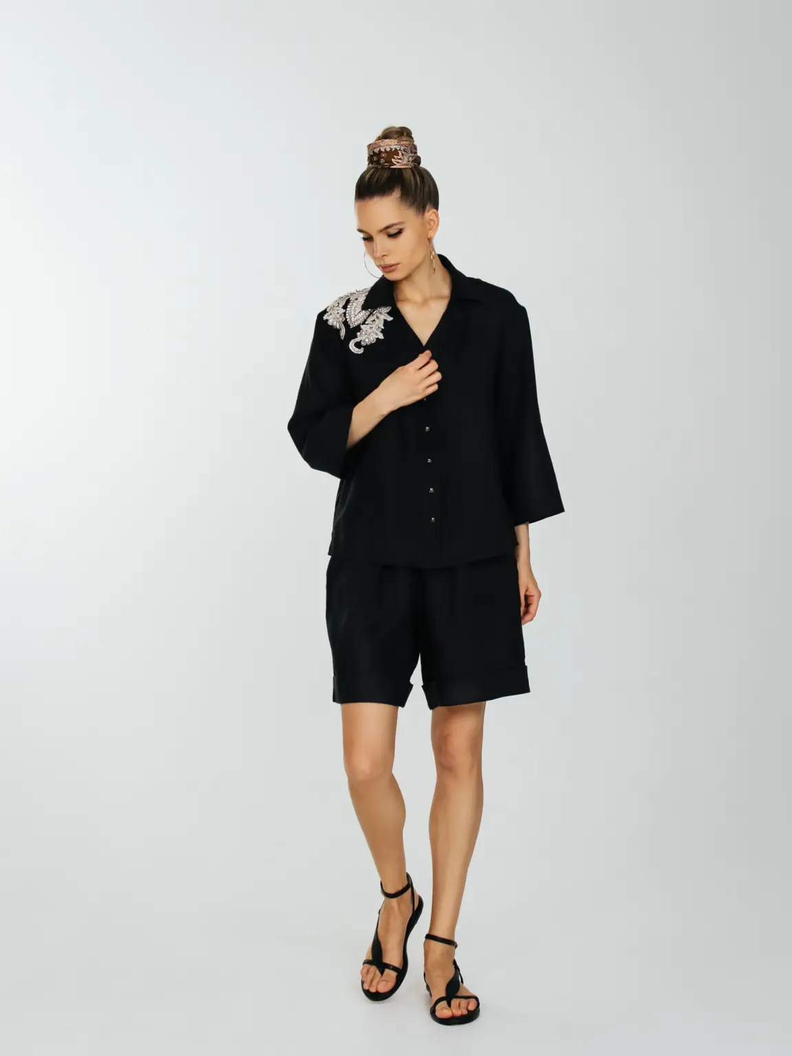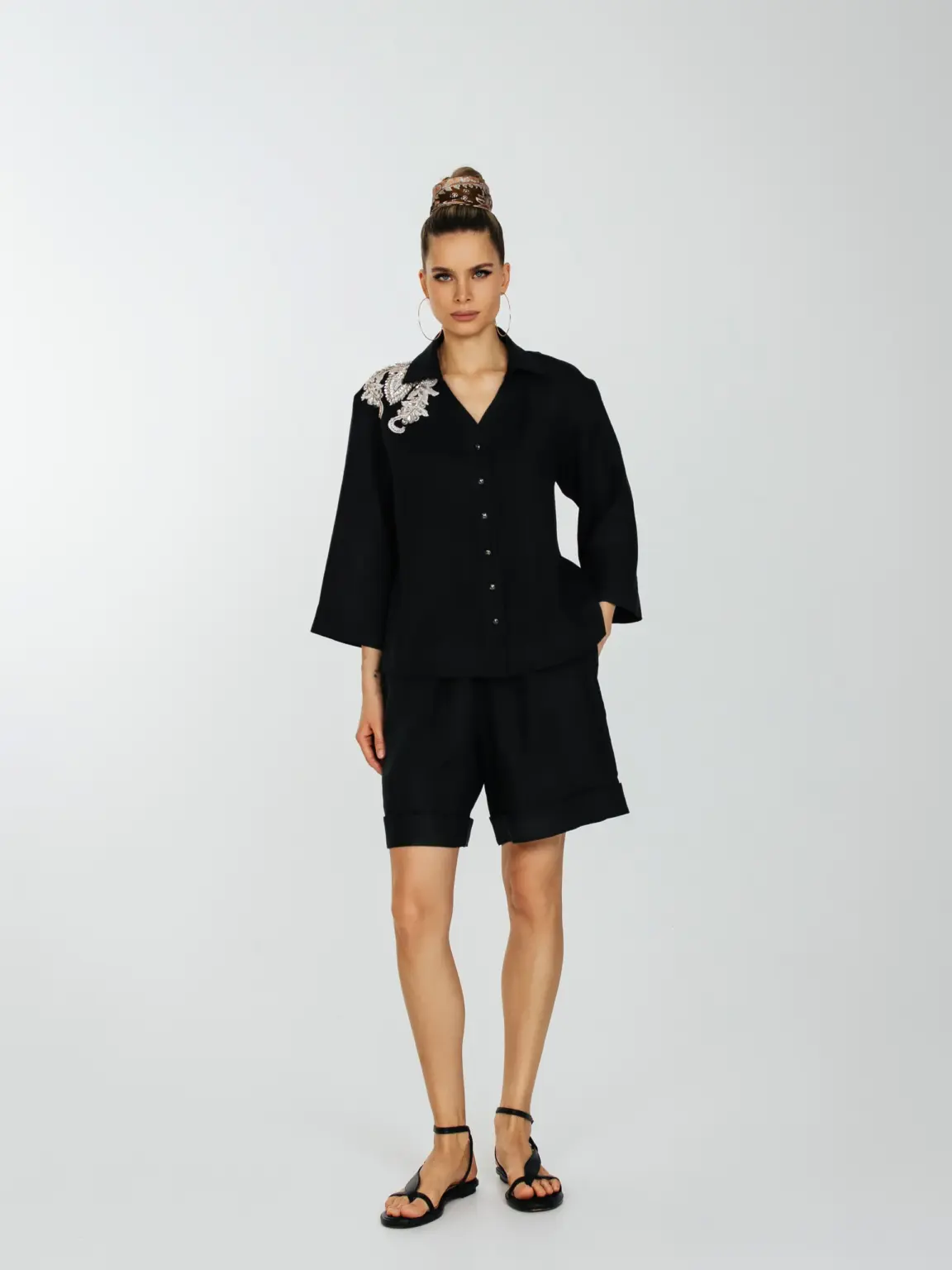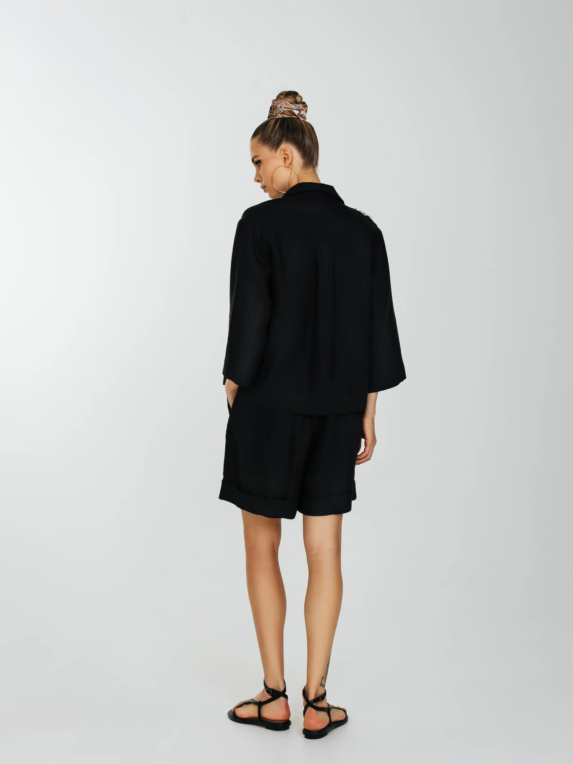 Рубашка прямого силуета с укороченным втачным рукавом и слегка спущенным плечевым швом.