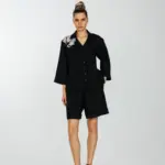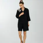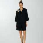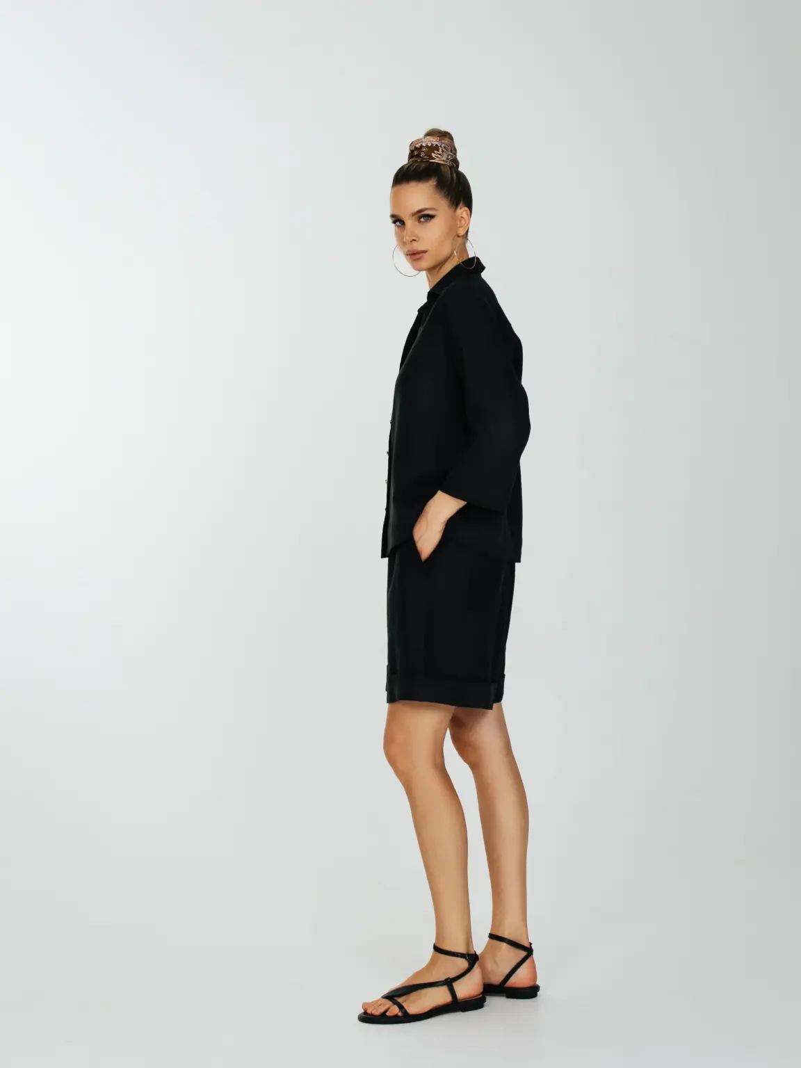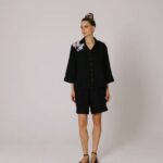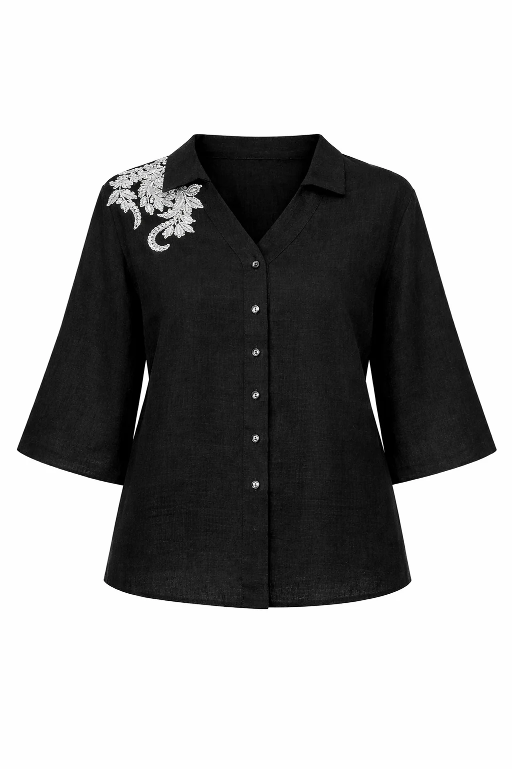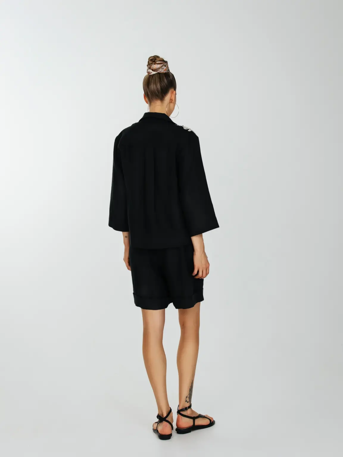 Рубашка прямого силуета с укороченным втачным рукавом и слегка спущенным плечевым швом.