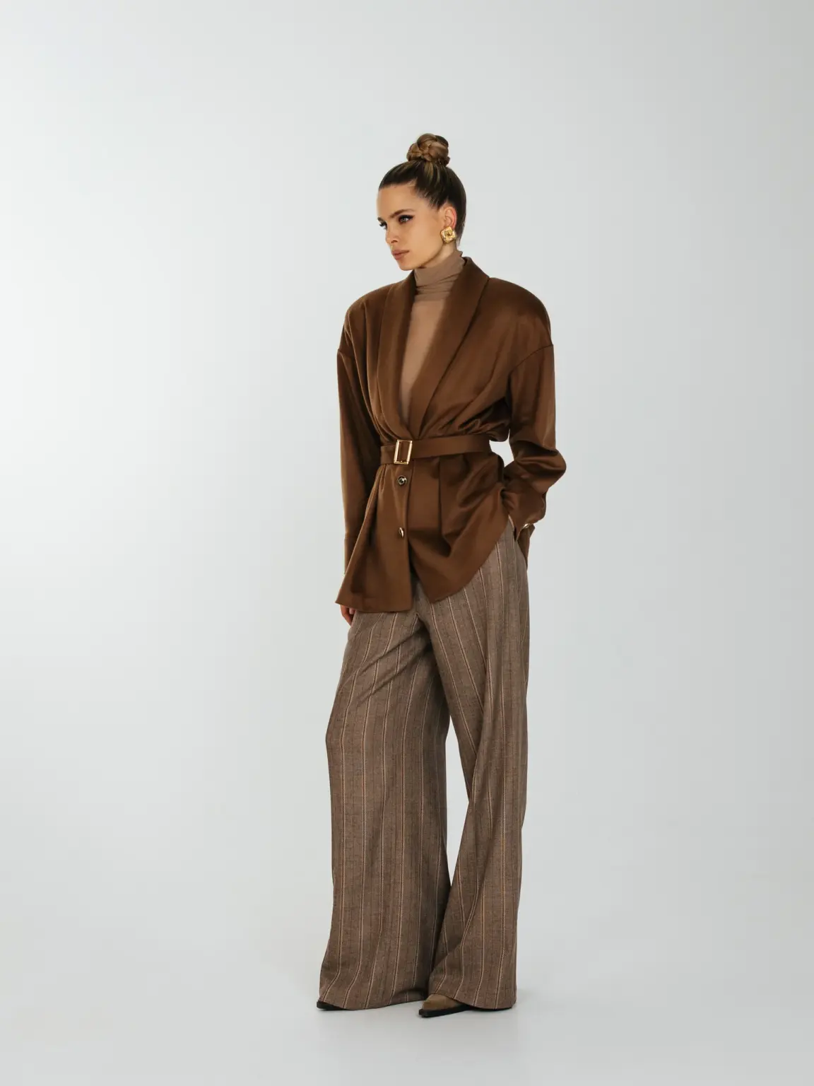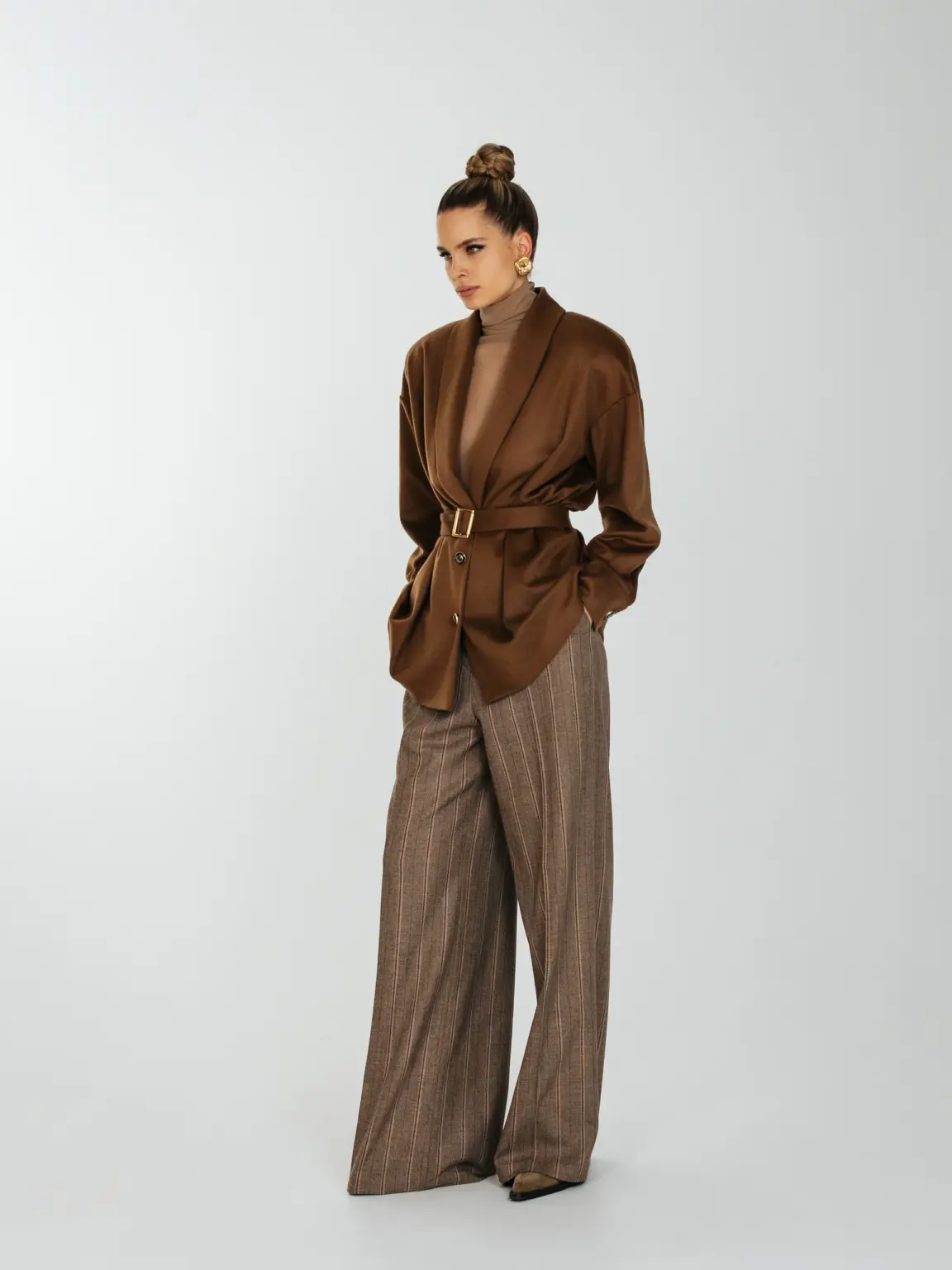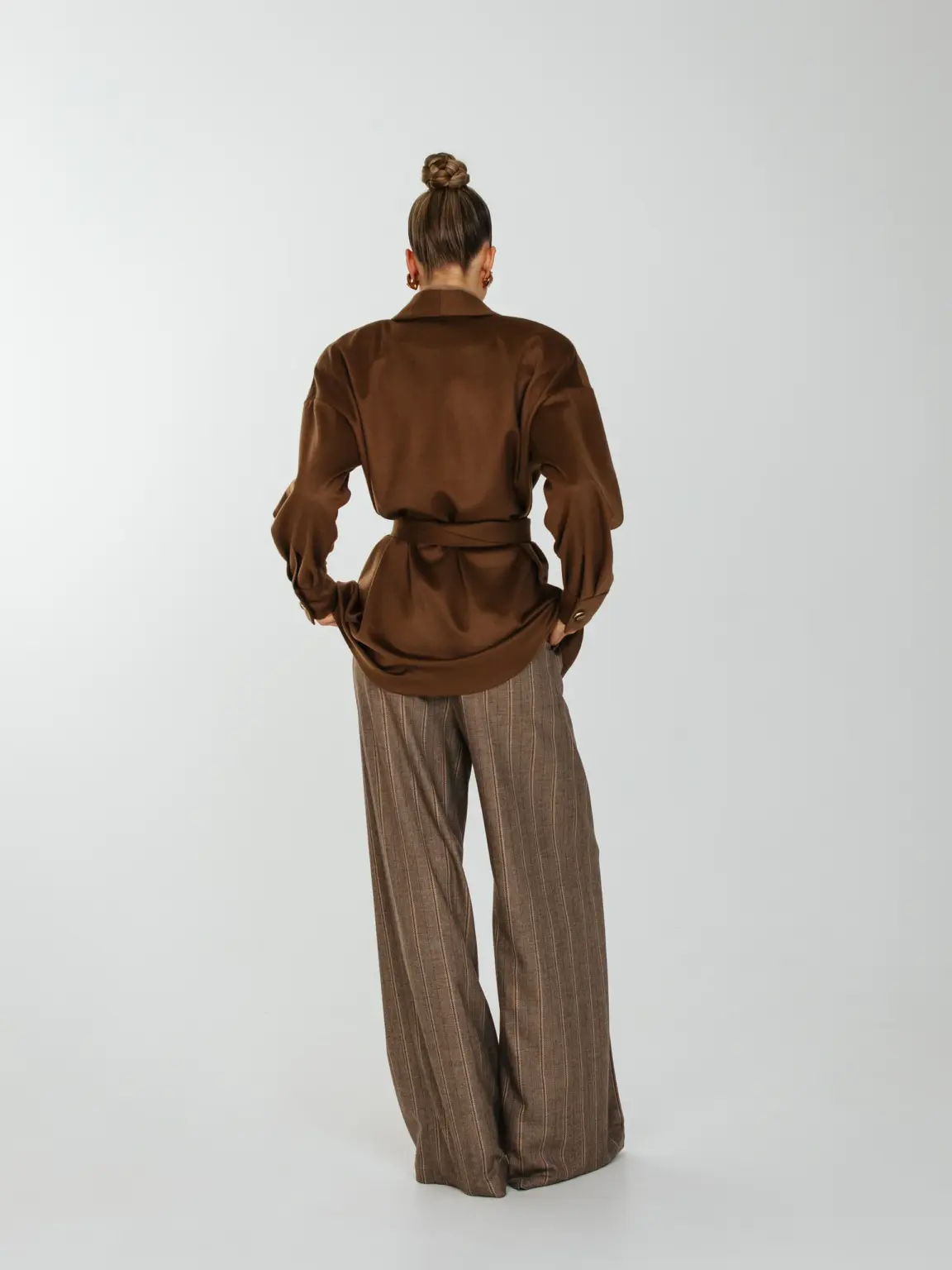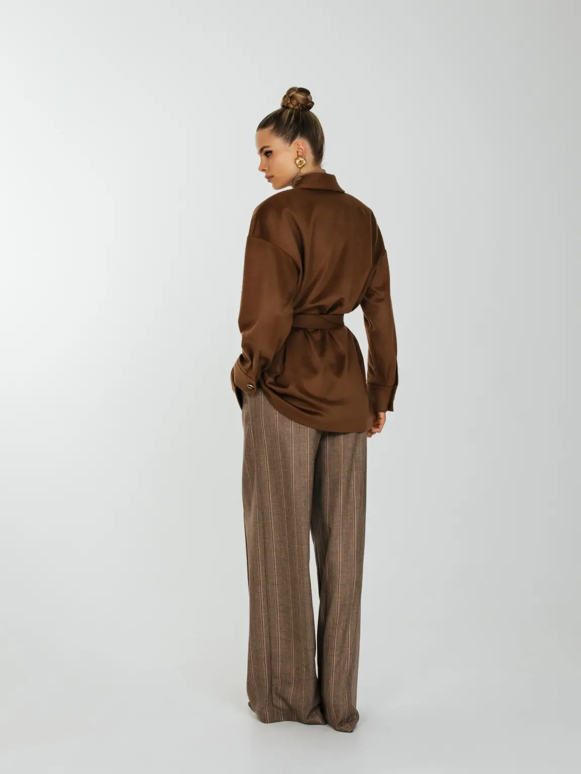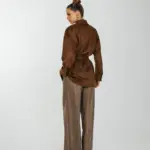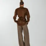 Рубашка свободного кроя с увеличенным и спущенным плечом на подплечниках и поясом.
