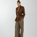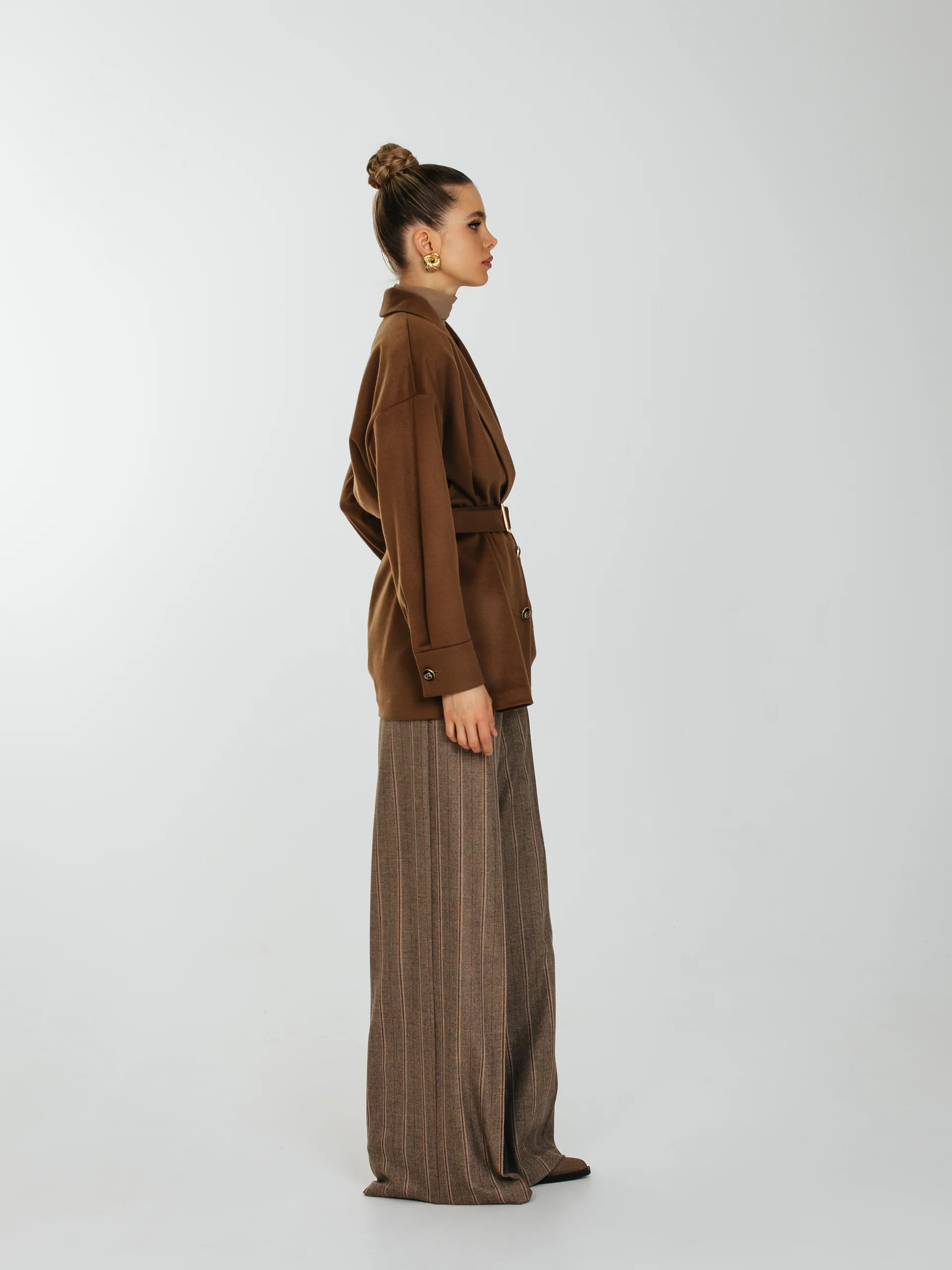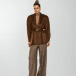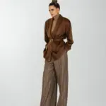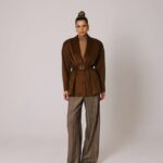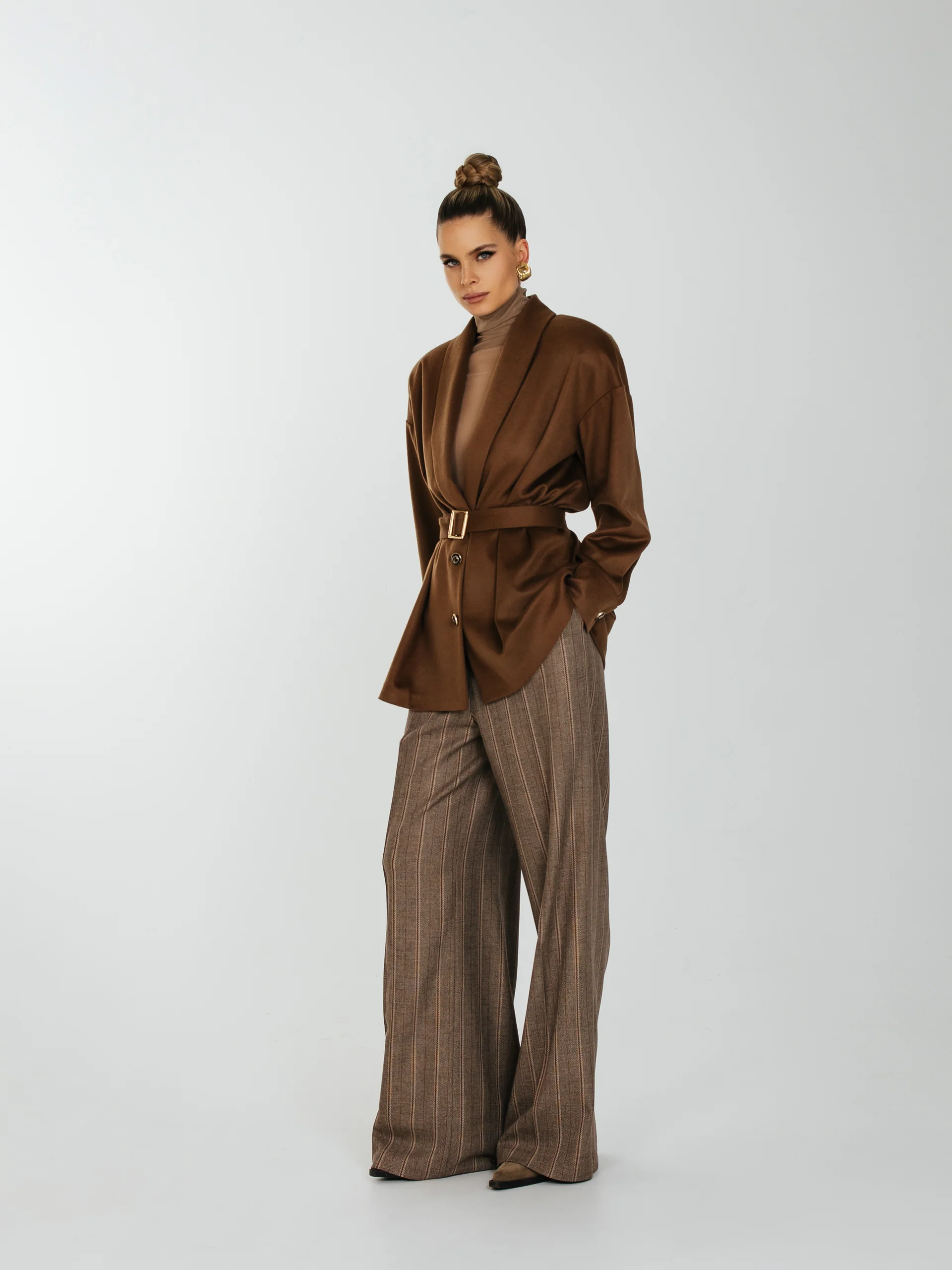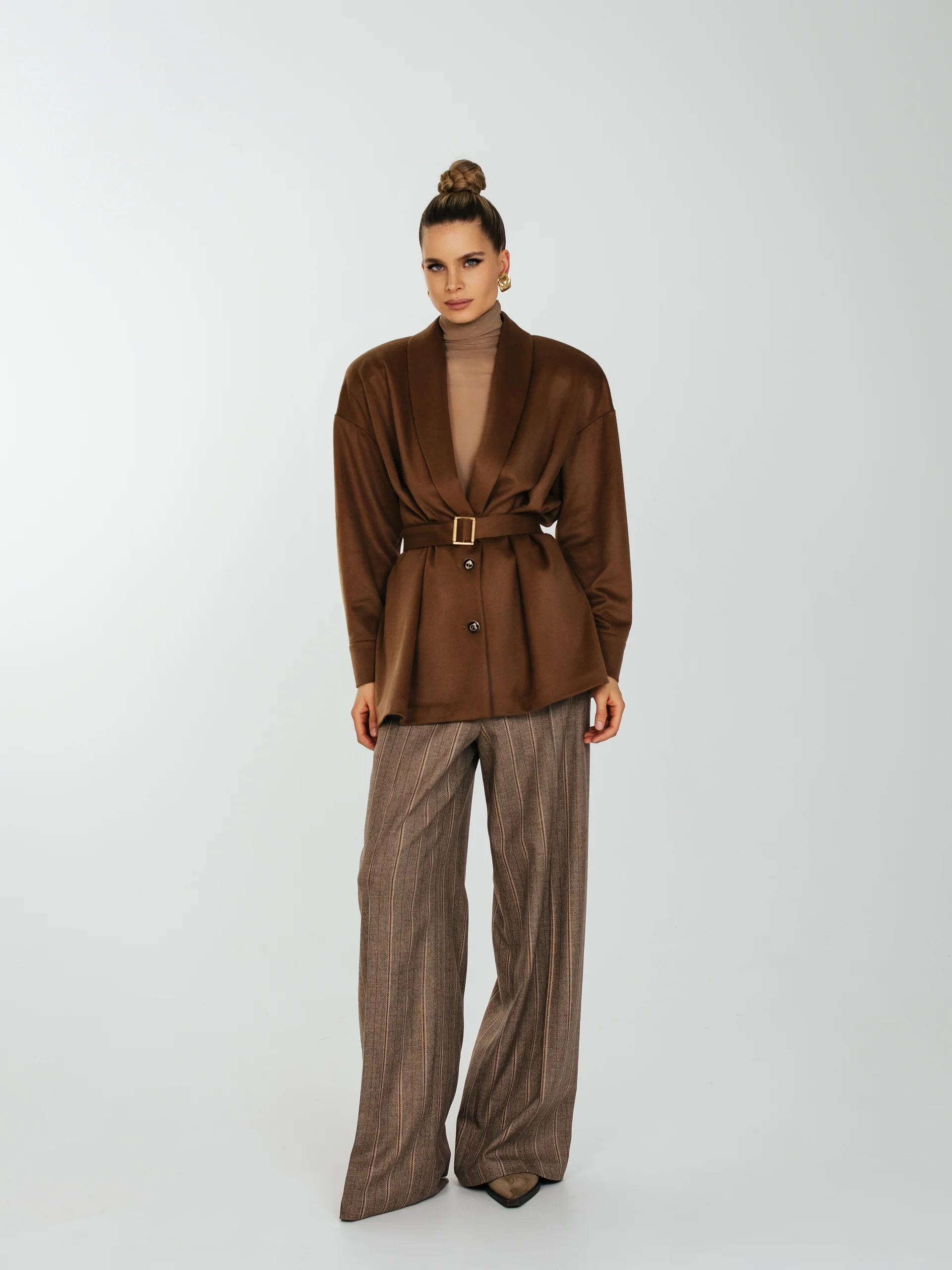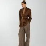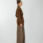 Рубашка свободного кроя с увеличенным и спущенным плечом на подплечниках и поясом.