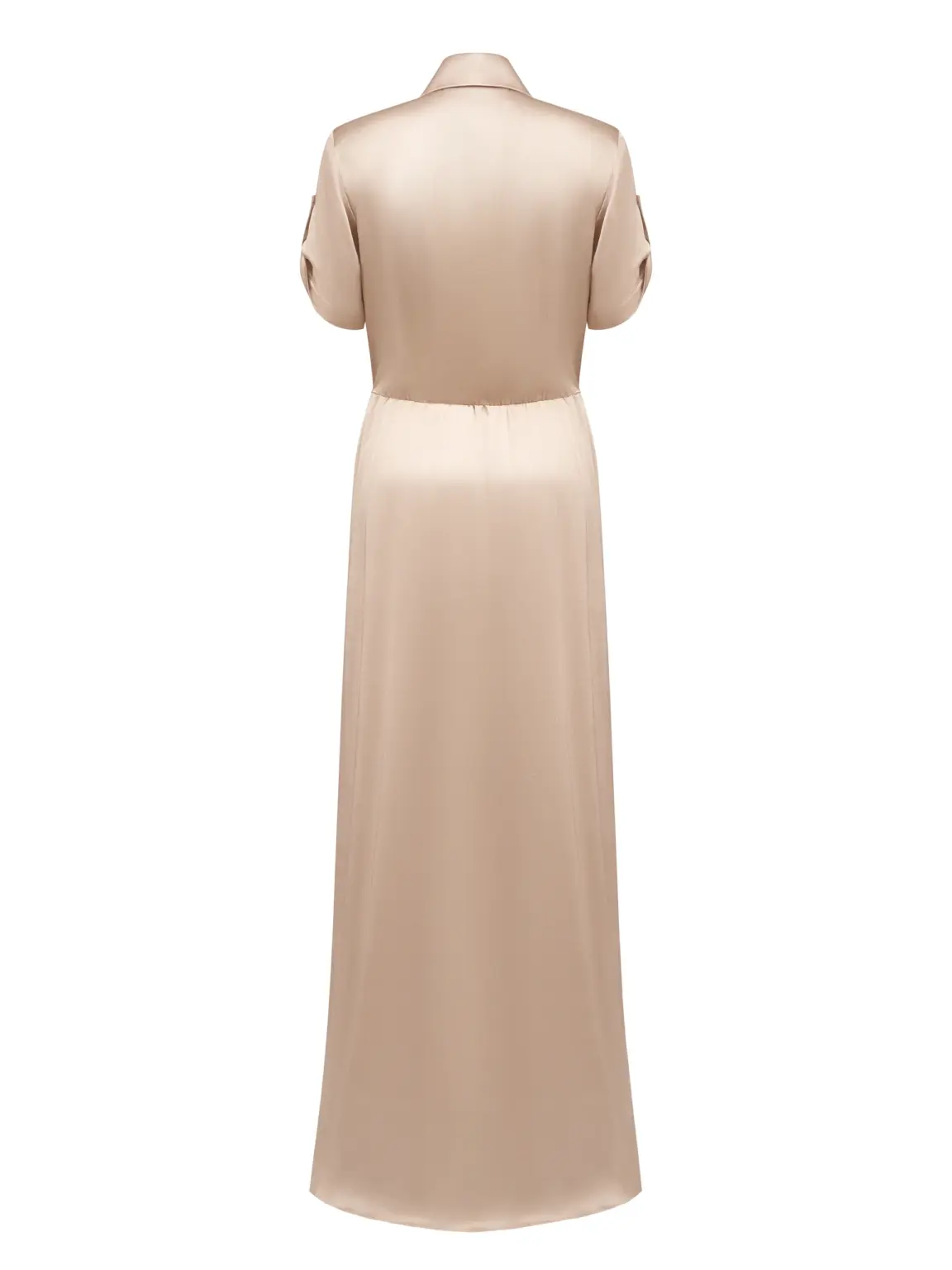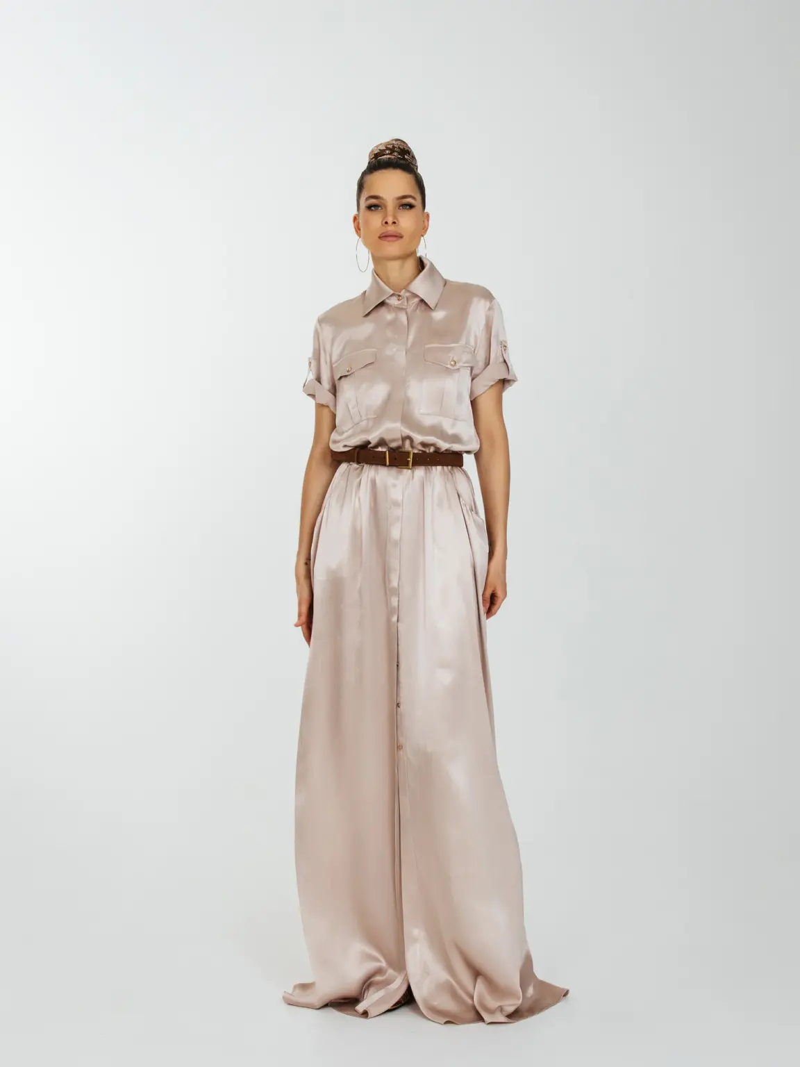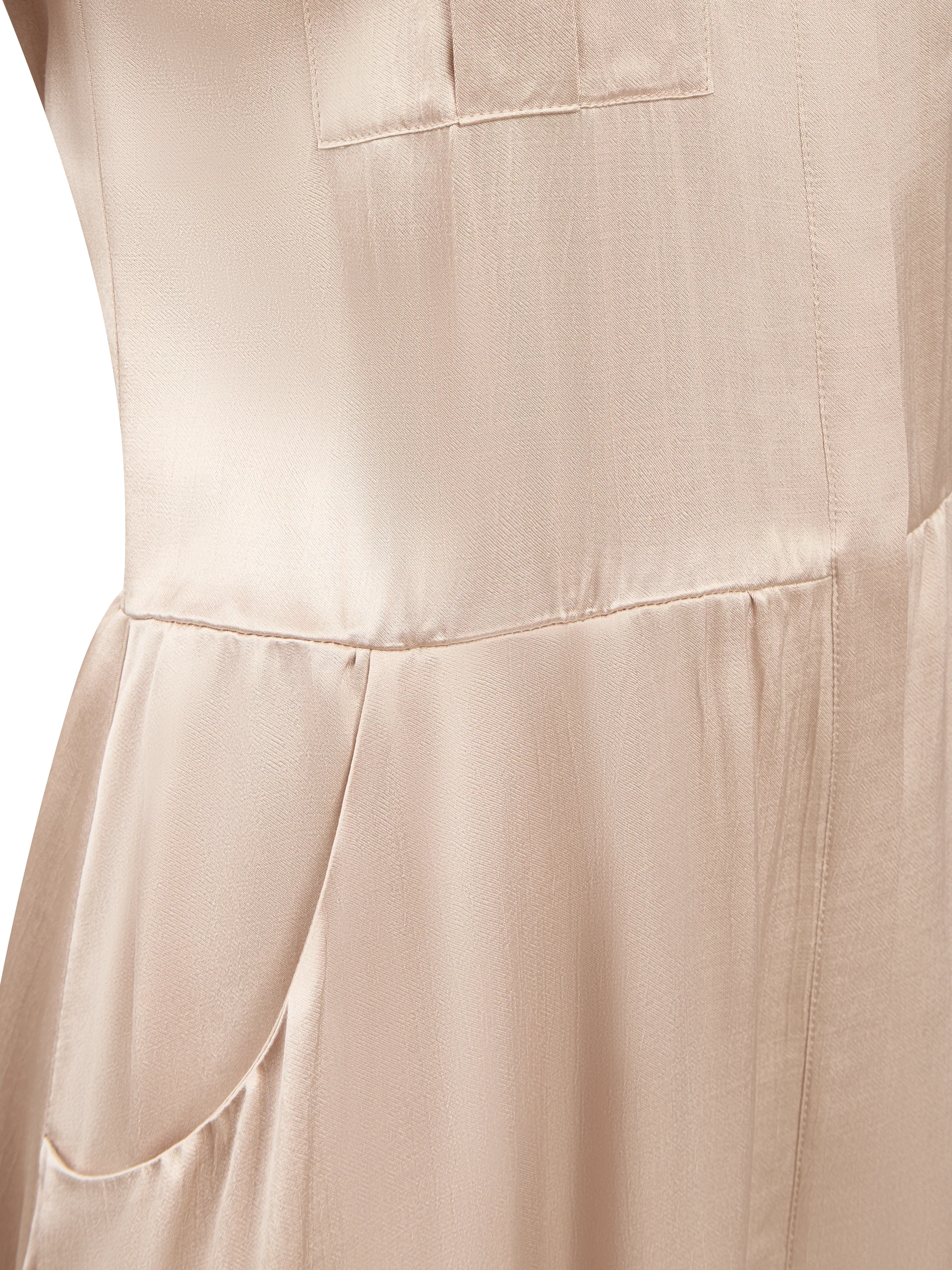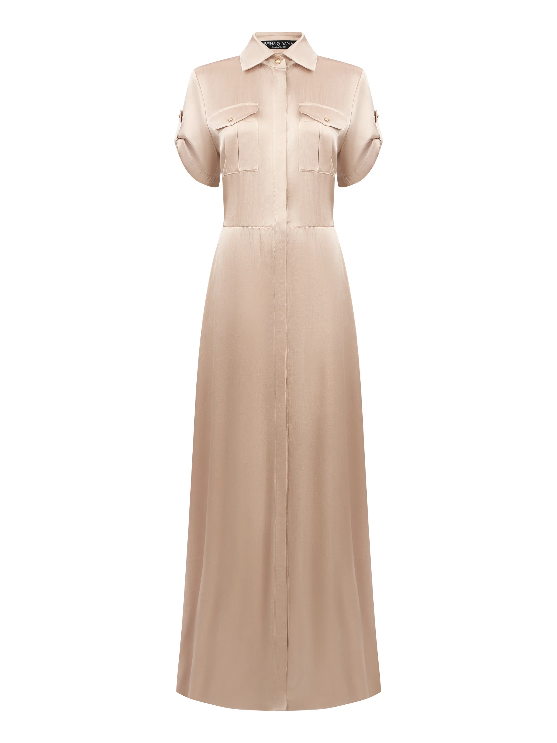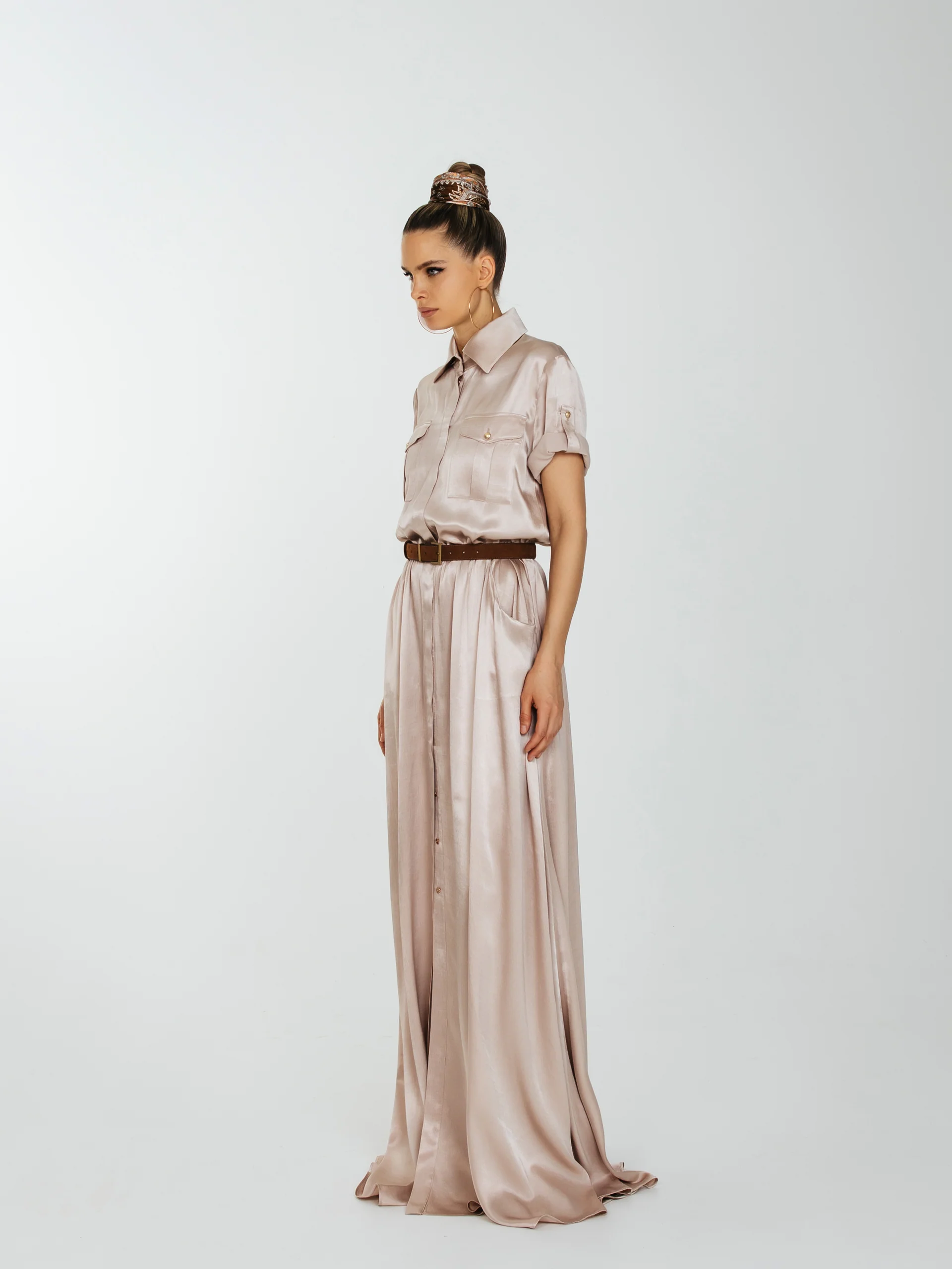 Струящее платье длиною в пол с накладными нагрудными карманами и с карманами по боковому шву.