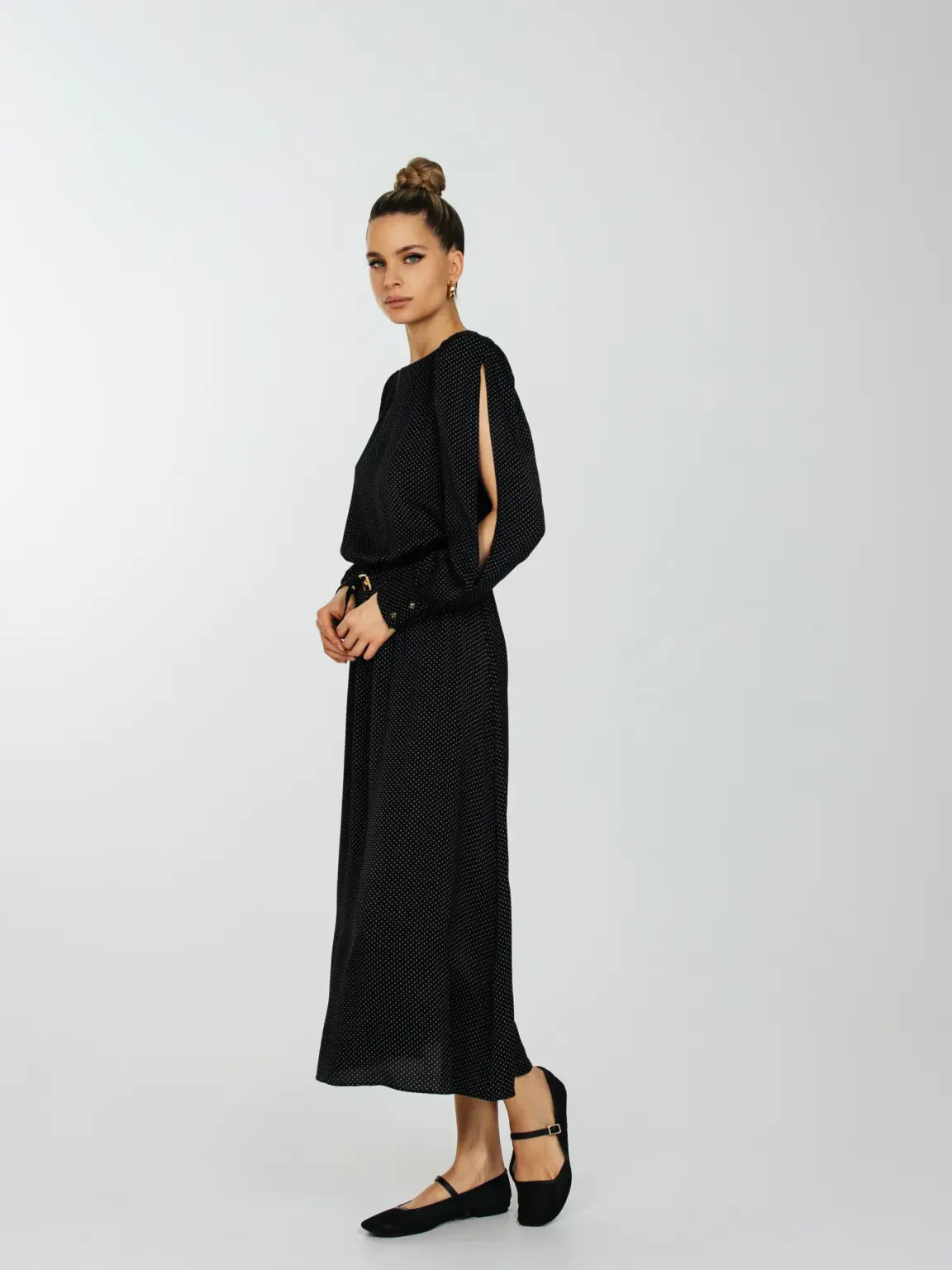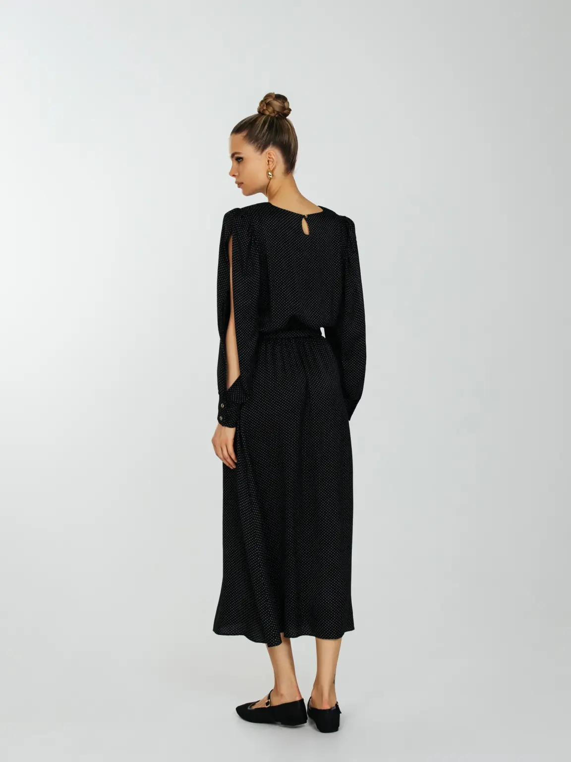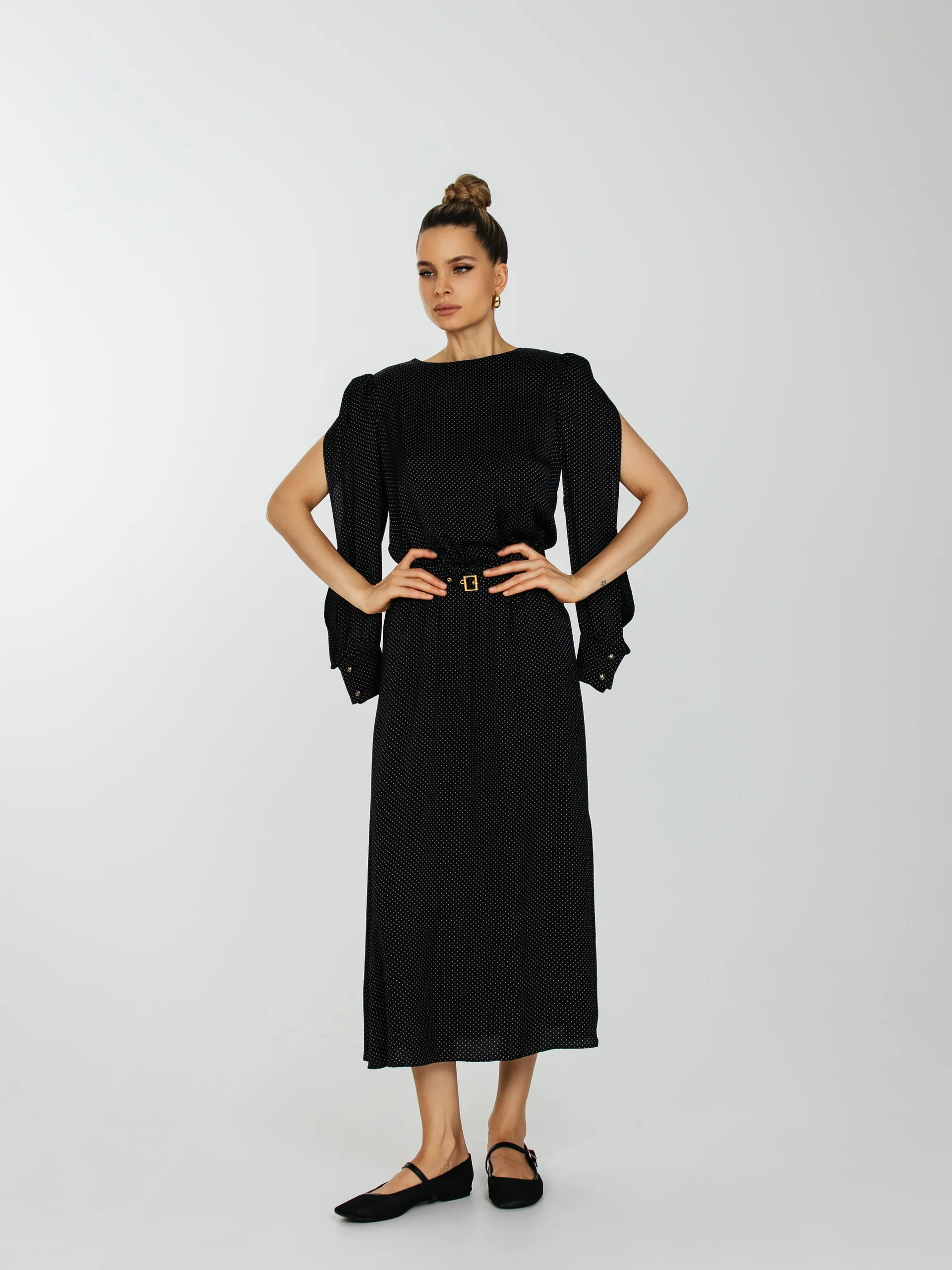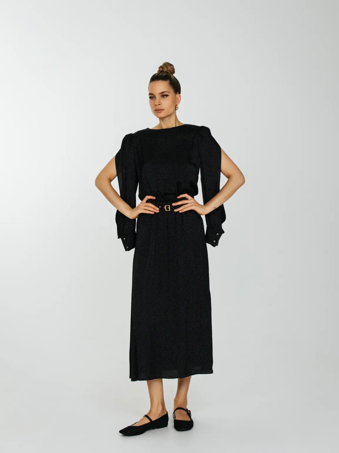 Платье с ярко выраженной линией плеча за счёт подплечников, с разрезами на рукавах и поясом.