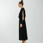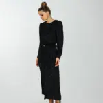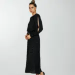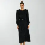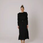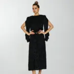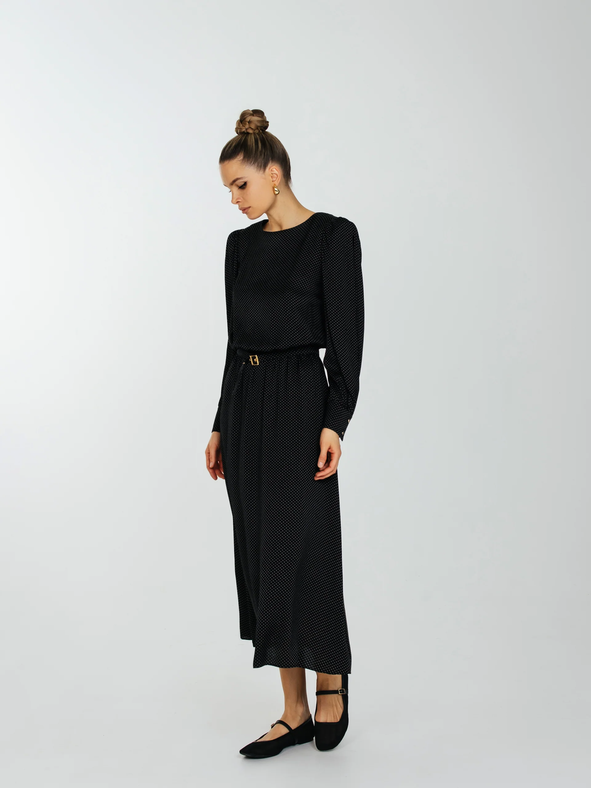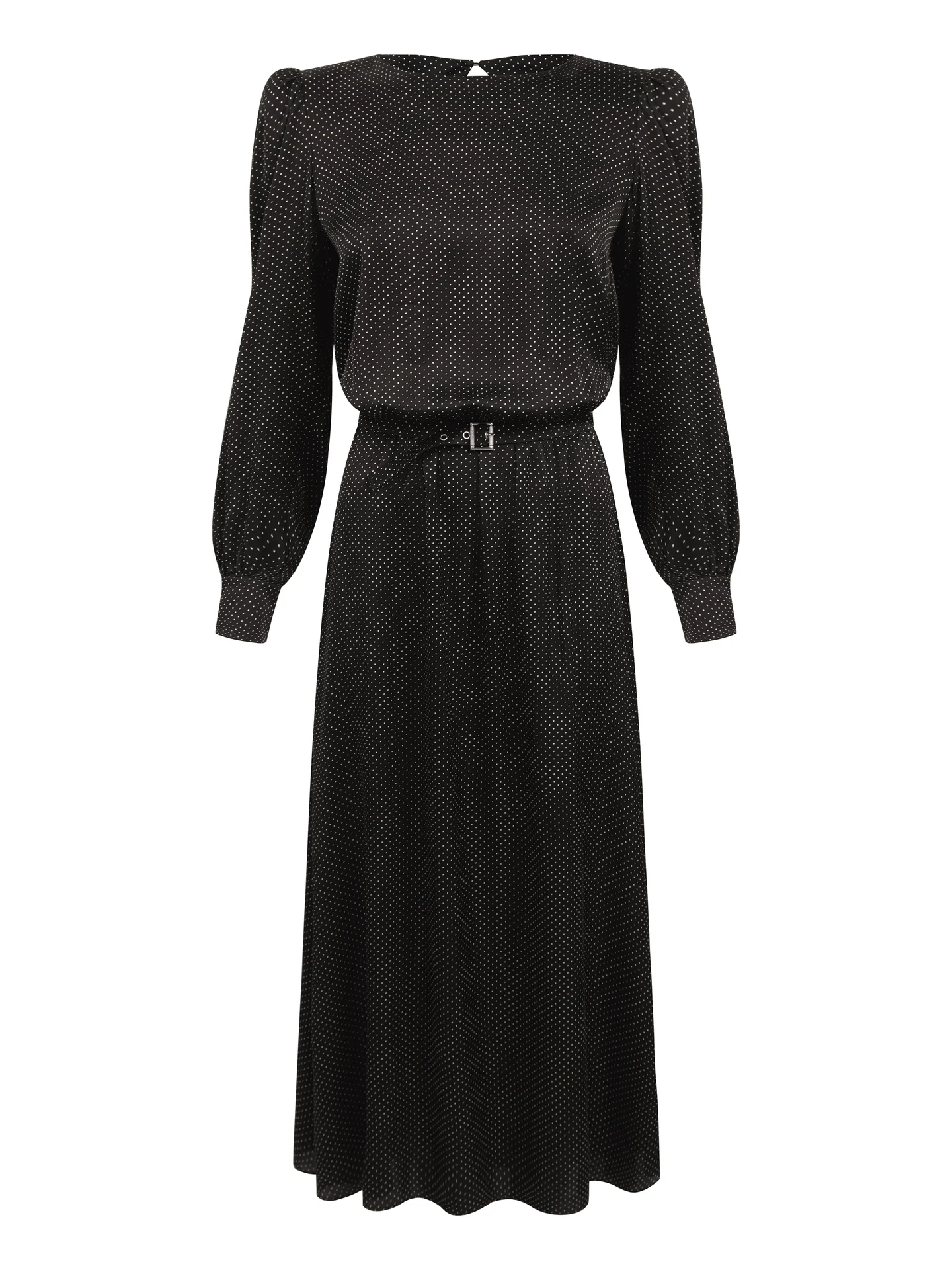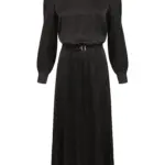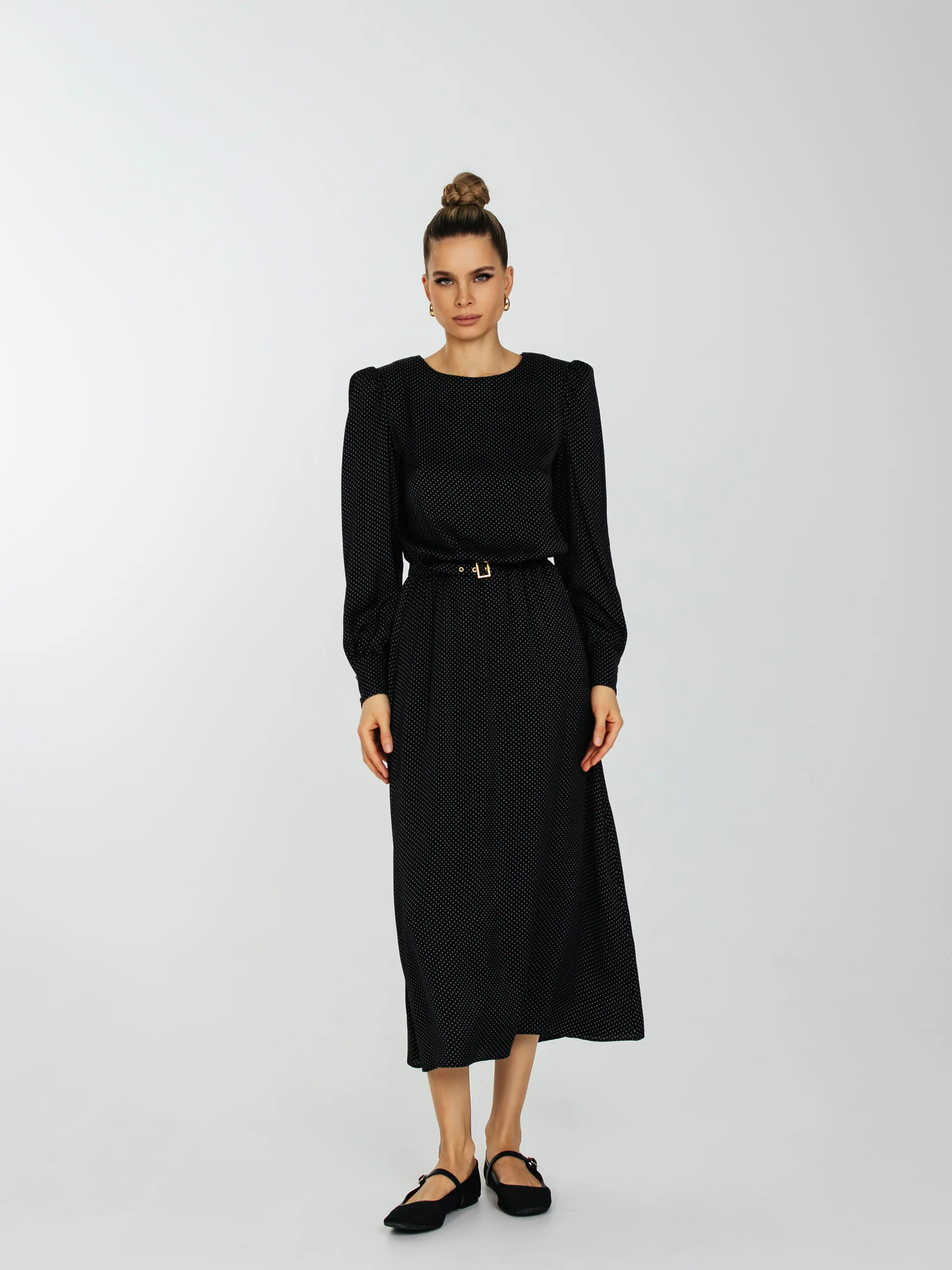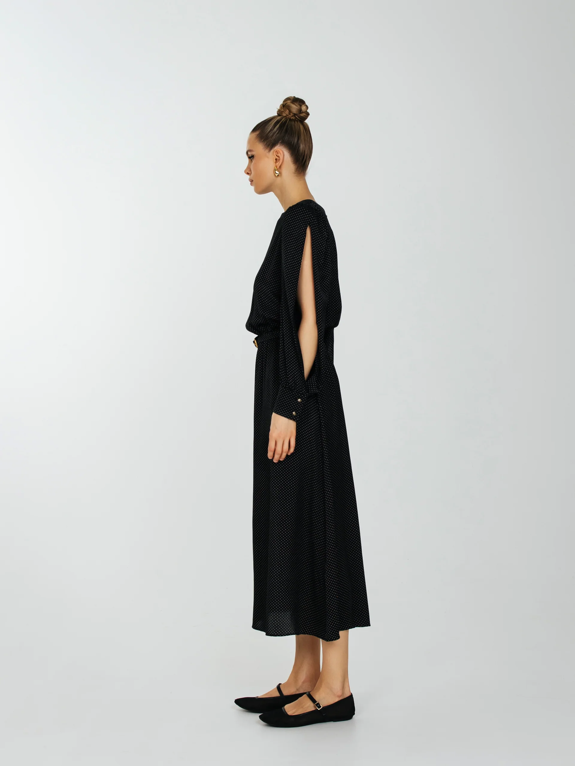 Платье с ярко выраженной линией плеча за счёт подплечников, с разрезами на рукавах и поясом.