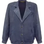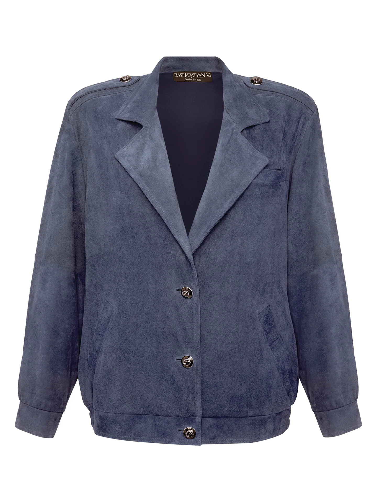 Бомбер свободного кроя, выполнен из мягкой натуральной замши с завышенным плечом за счёт подплечника.