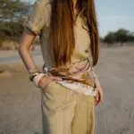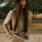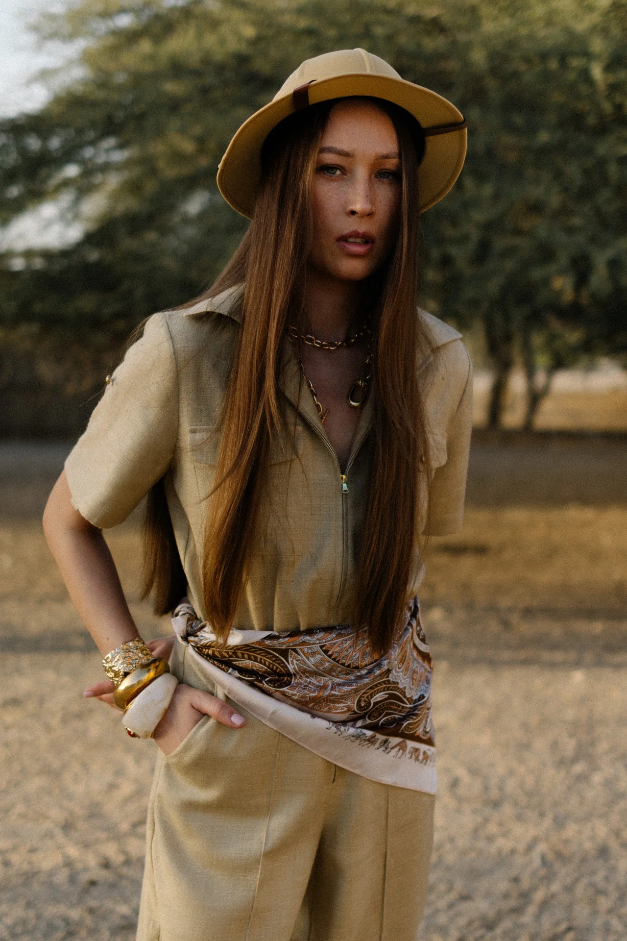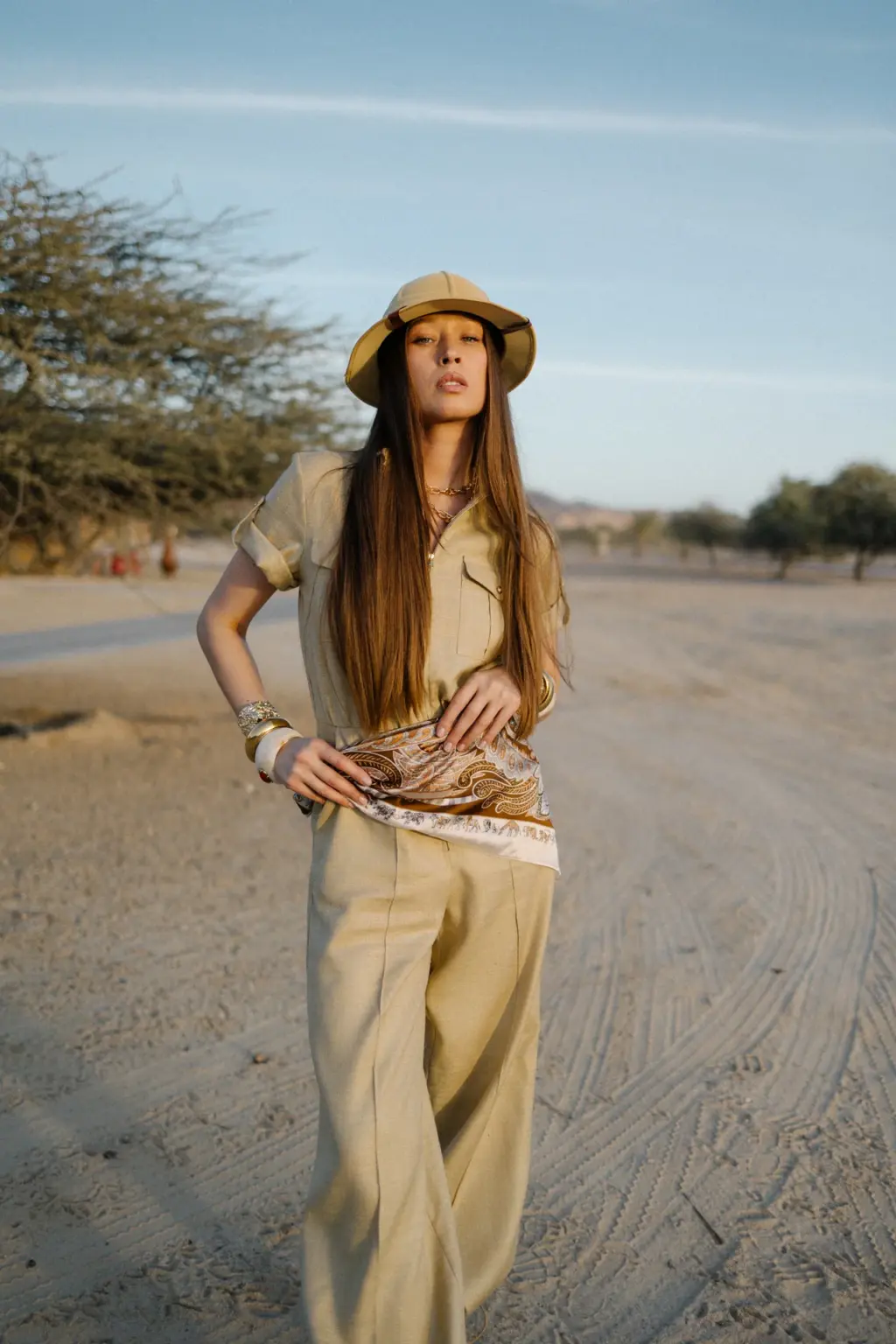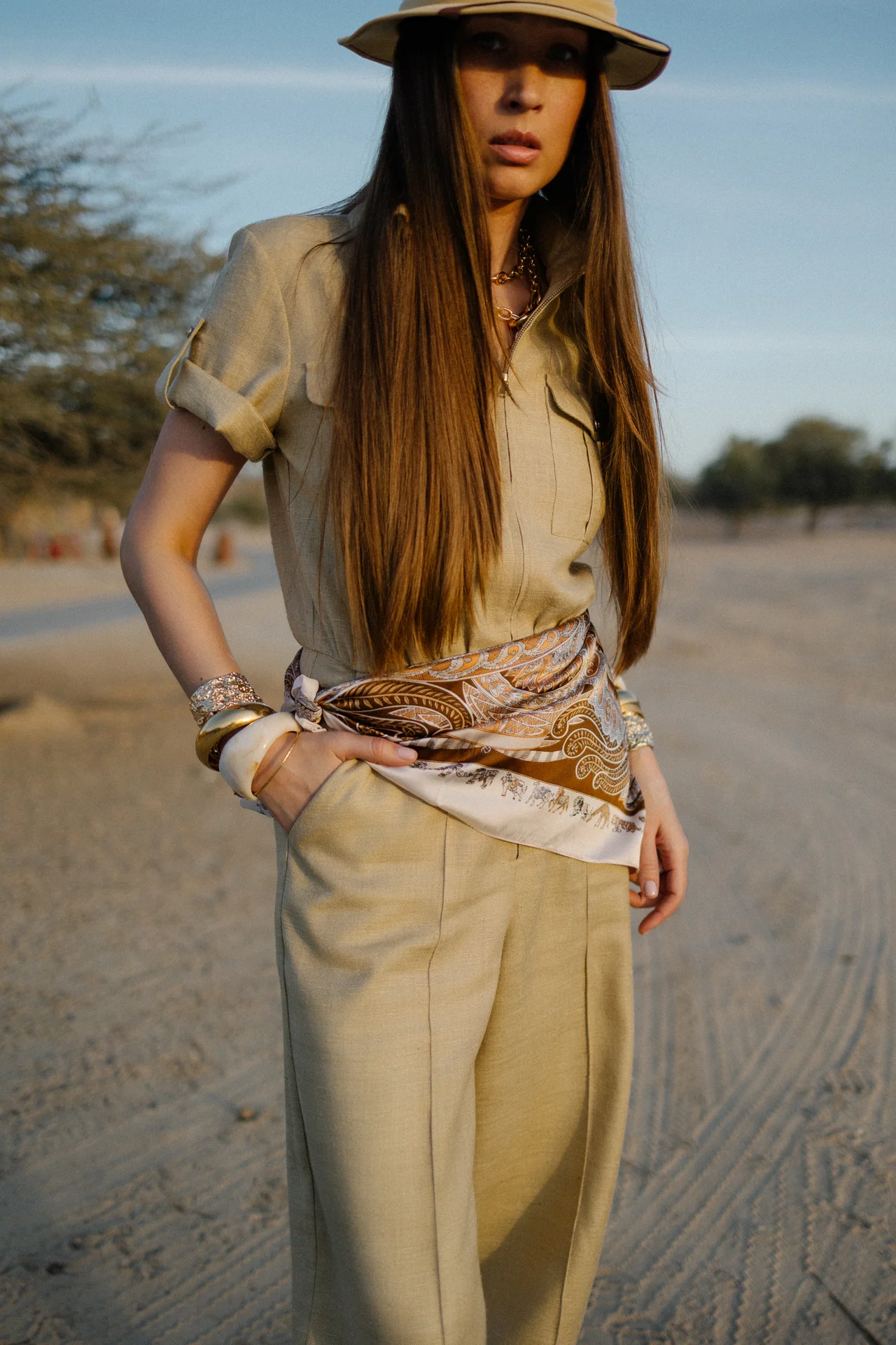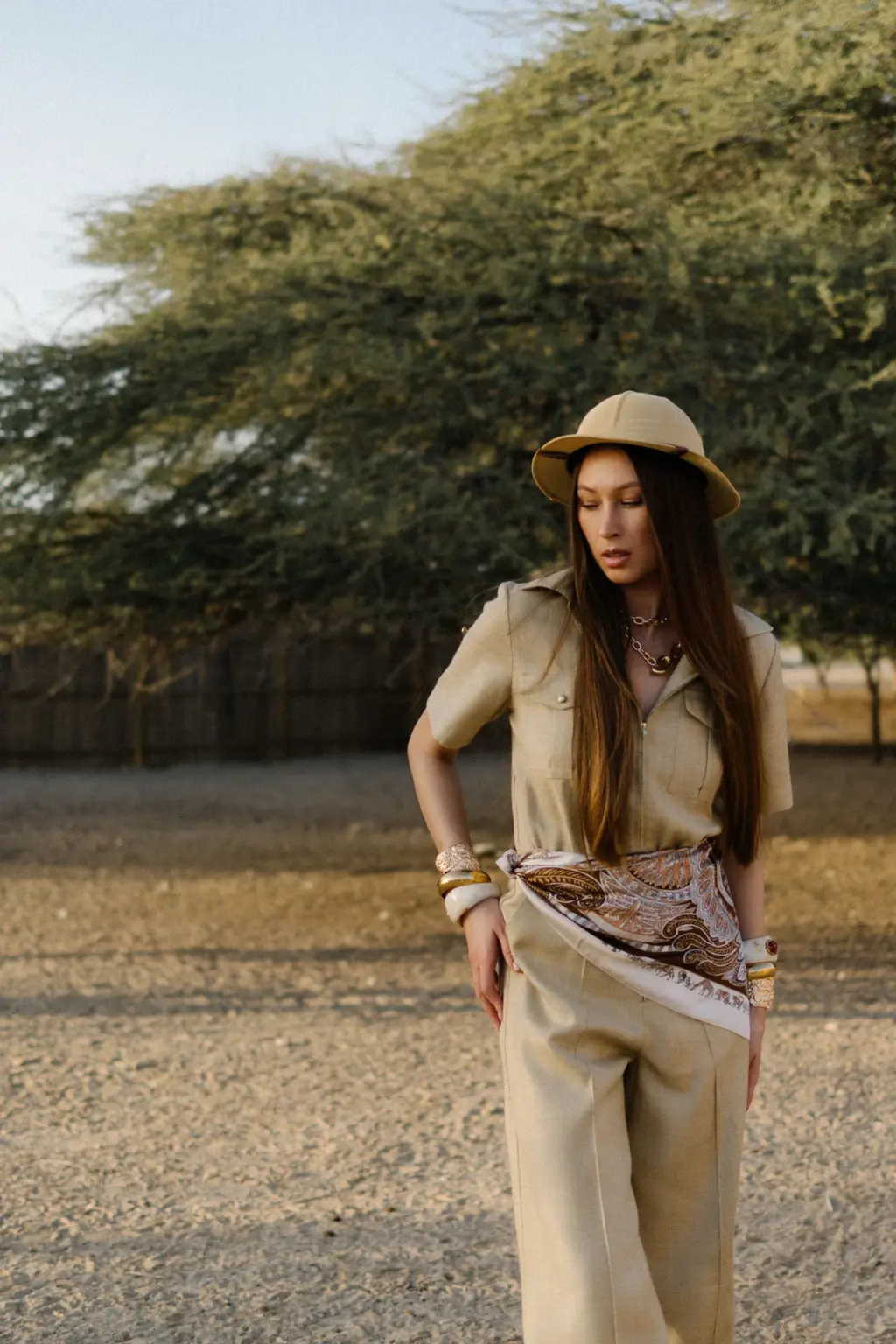Комбинезон длиною в пол с накладными нагрудными карманами.