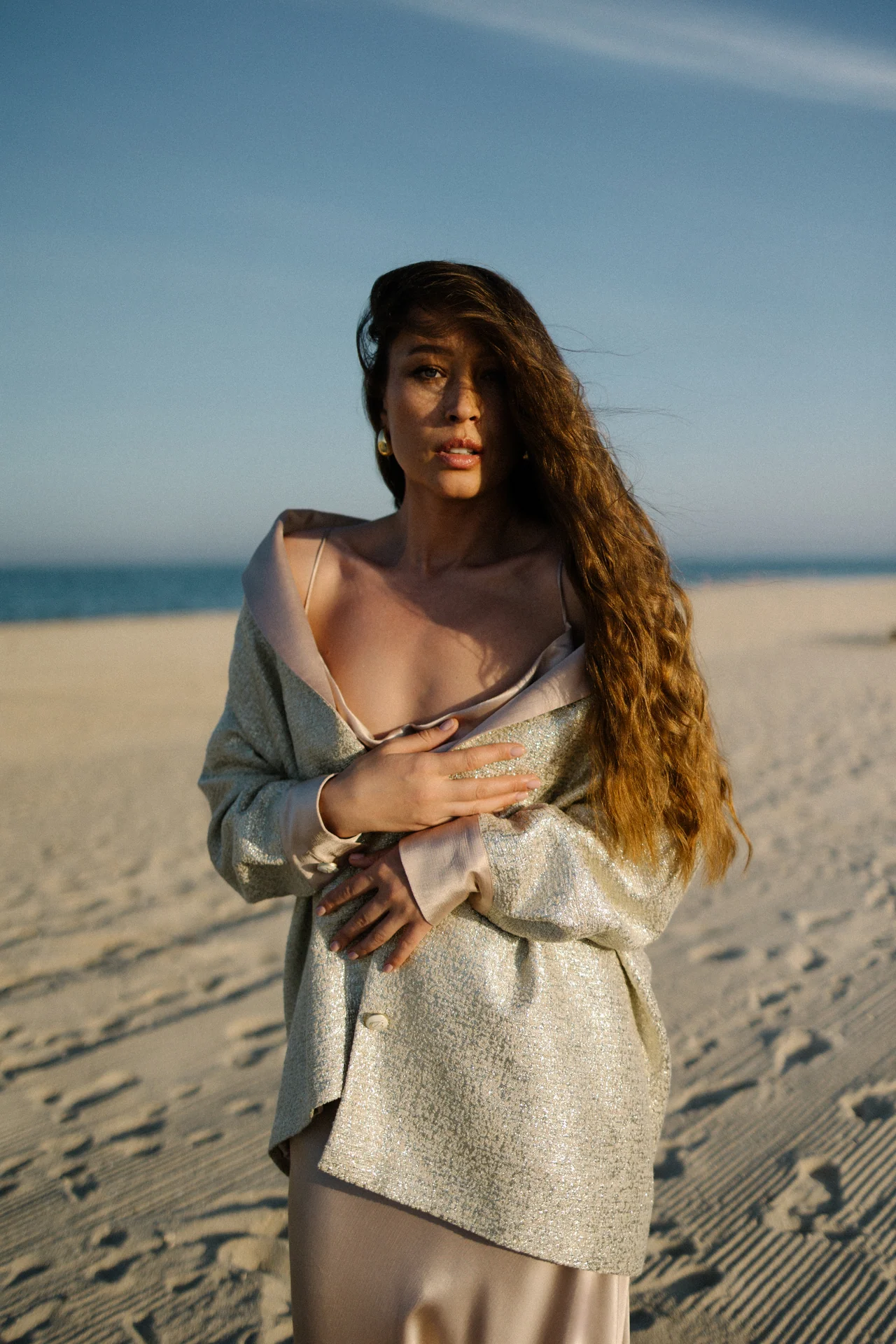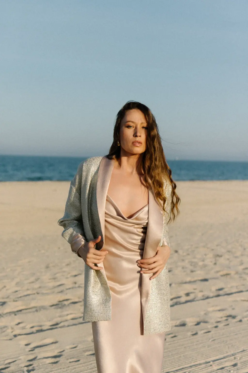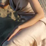 Рубашка свободного кроя с увеличенным и спущенным плечом на подплечниках и поясом.