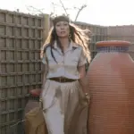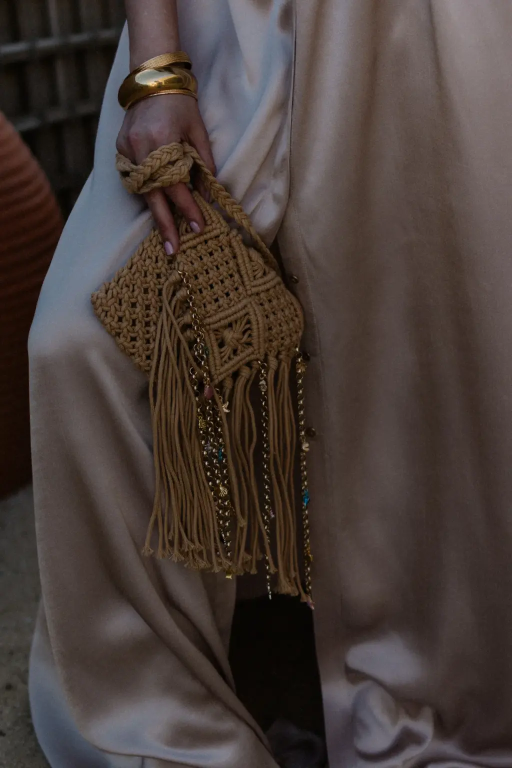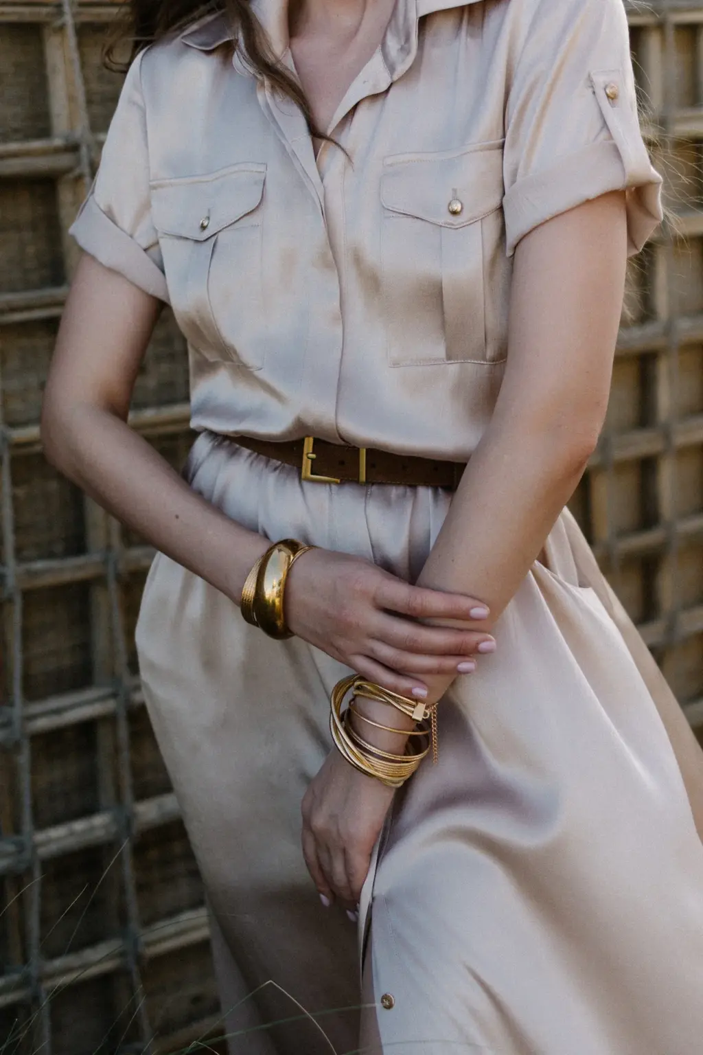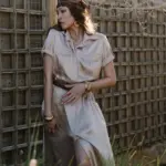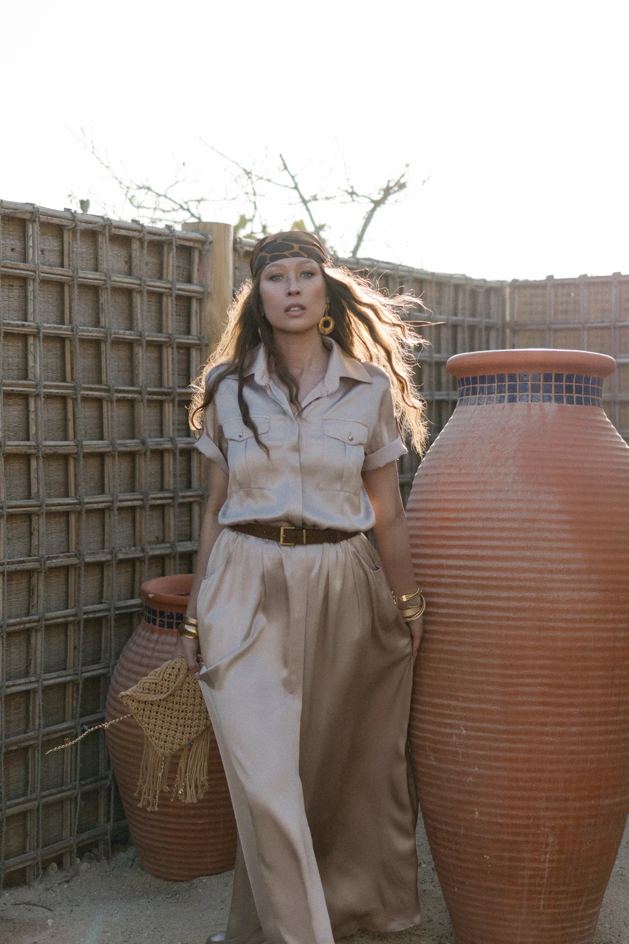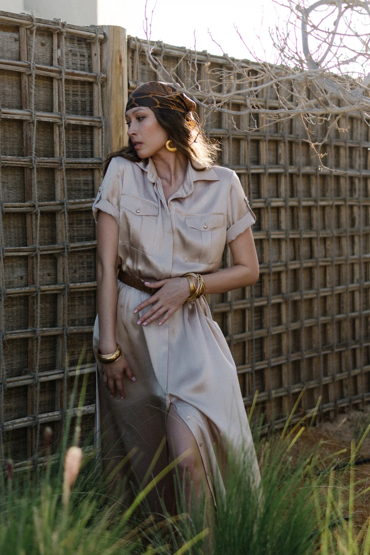 Струящее платье длиною в пол с накладными нагрудными карманами и с карманами по боковому шву.